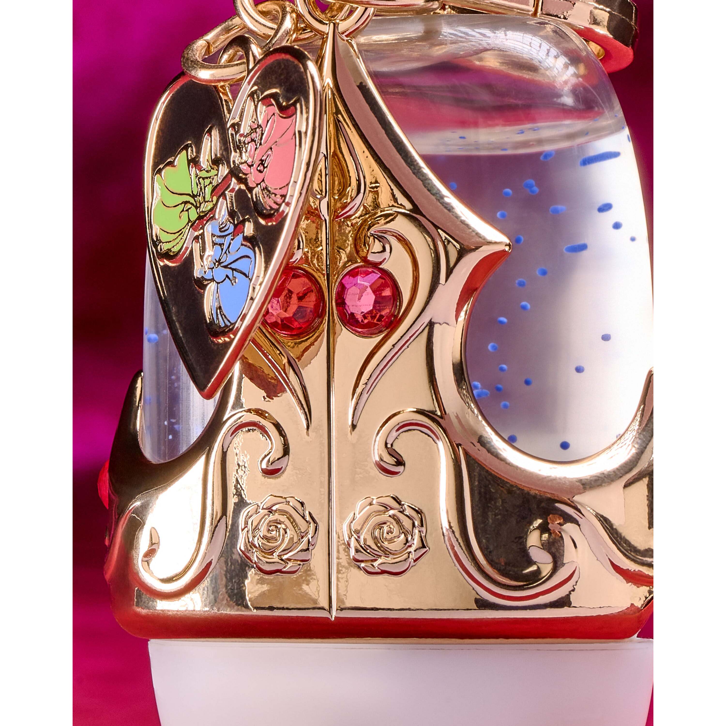 Crown Your Favorite Hand Sanitizer With This Exquisite Gold-Toned Pocketbac Holder. Decorated With Glittering Pink Gems, Delicate Rose Motifs And A Dangling Charm With Aurora’s Three Good Fairies, This Regal Accessory Encourages You To Keep Your Hands Clean Wherever Your Story Takes You.