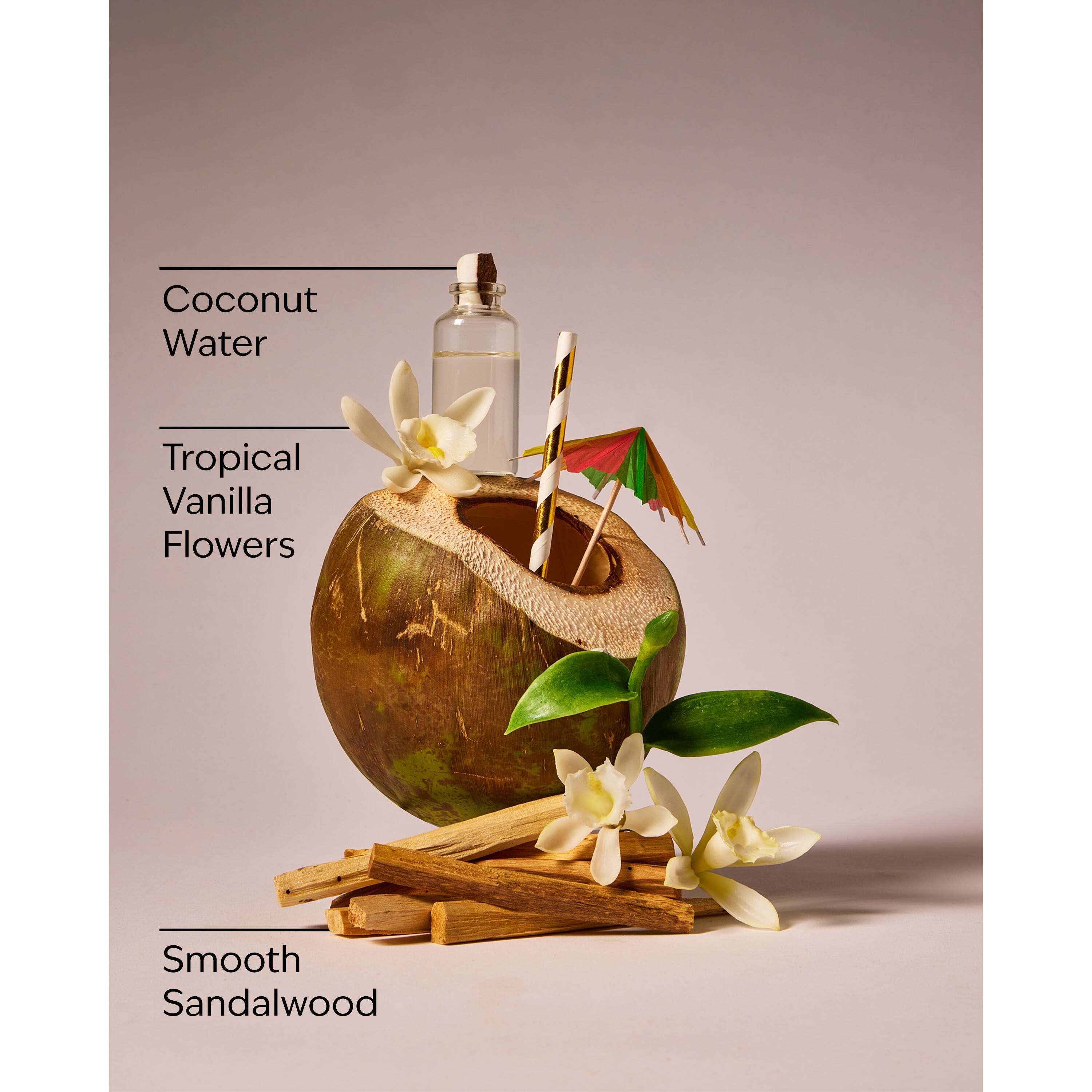 Fragrance Notes: Tropical Vanilla Flowers, Coconut Water And Smooth Sandalwood.